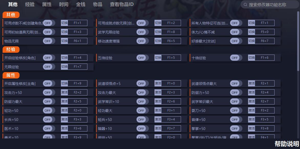 3.开启修改器各主初始项再使用各子修改项[无主初始项则不用开启][主初始项:如开启...修改]。